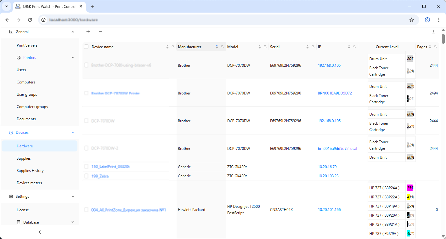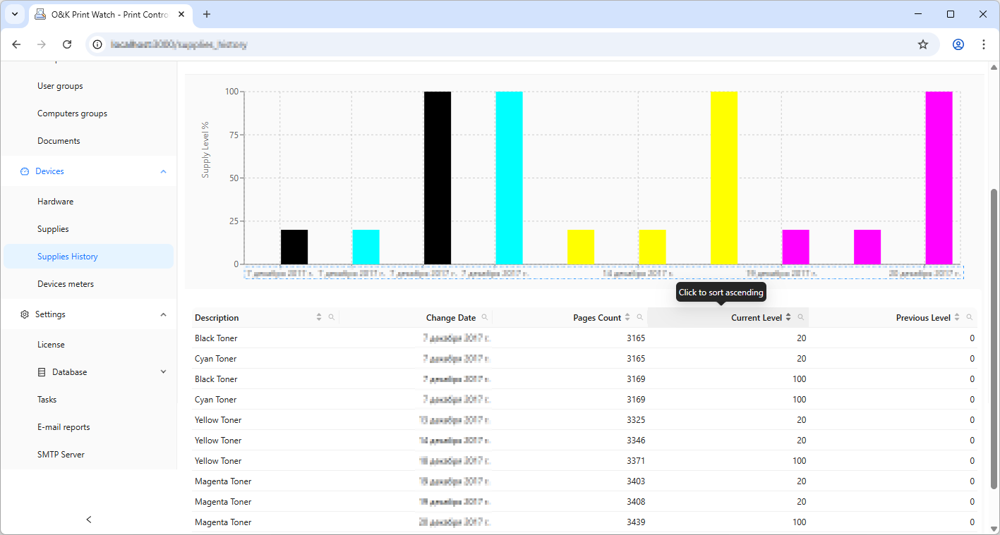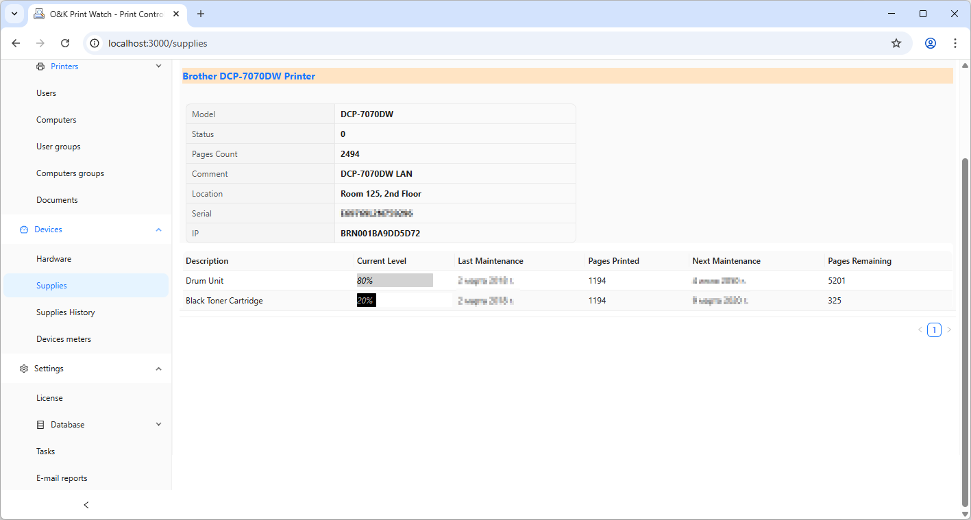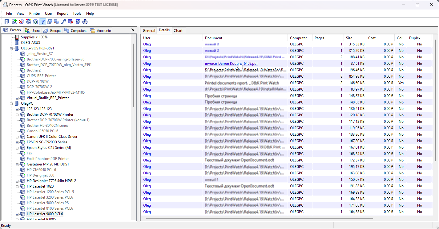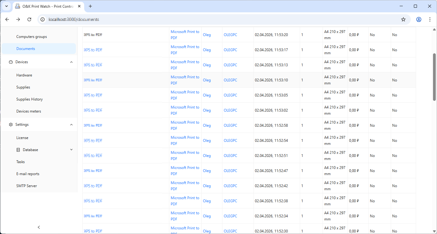 На этой странице представлены реальные скриншоты O&K Print Watch — системы контроля печати, предназначенной для отслеживания использования принтеров, анализа истории печати и аудита действий пользователей.