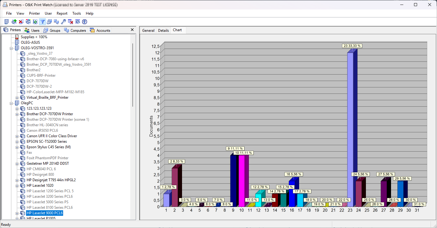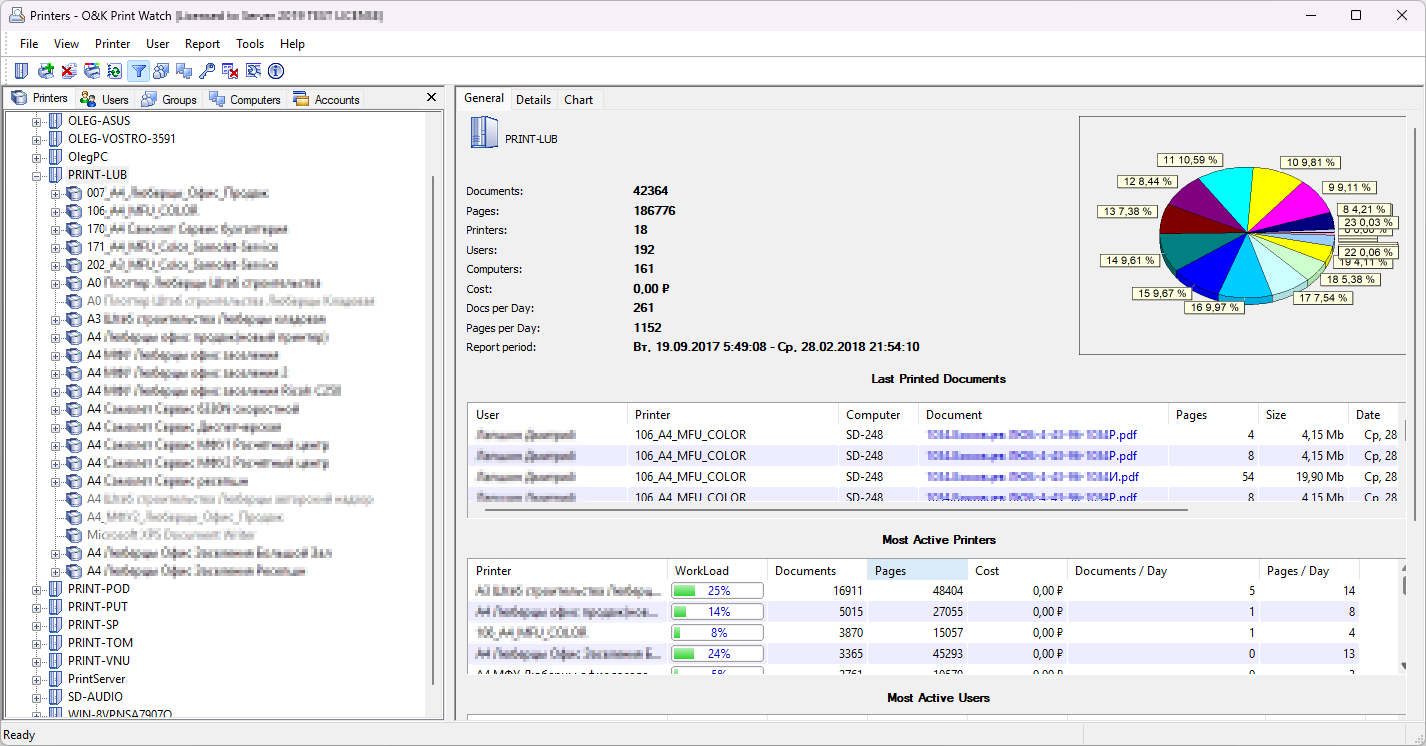 Ознакомьтесь с интерфейсом, отчетами, графиками и просмотром распечатанных документов, чтобы понять, как программа помогает контролировать печать на локальных и сетевых принтерах.